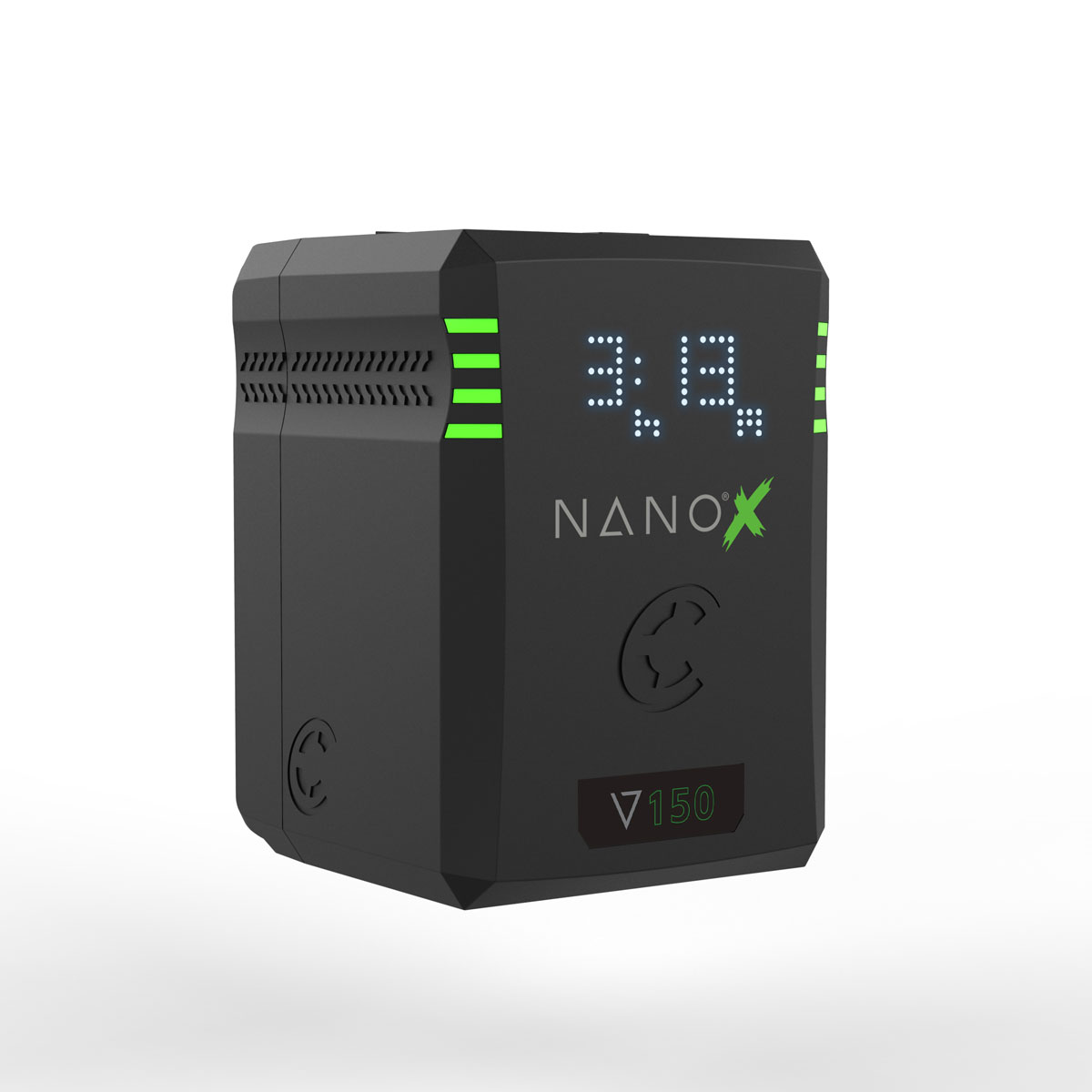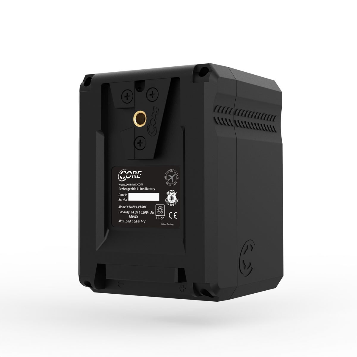 Nano-V150X 147wh Micro sized V-mount SMART battery pack, 14.8v 9.9Ah. 12A Draw(16A peak) with 4 LED Gauge.Intergrated Ptap Port and USBCPD, SMBUS Camera Communication.